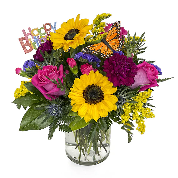 Celebrate a special birthday with our vibrant and cheerful birthday vase arrangement. This stunning display features a delightful mix of sunflowers, fuchsia pink roses, and purple carnations, perfectly complemented by a selection of purple and yellow fillers. The arrangement is finished with a whimsical butterfly accent and a festive “Happy Birthday” message, making it the perfect gift to brighten anyone’s special day.