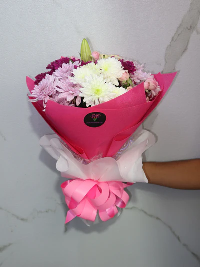 - Features a mix of vibrant flowers: pink lilies, pink spray roses, peach spray roses, and dark purple and white chrysanthemums.